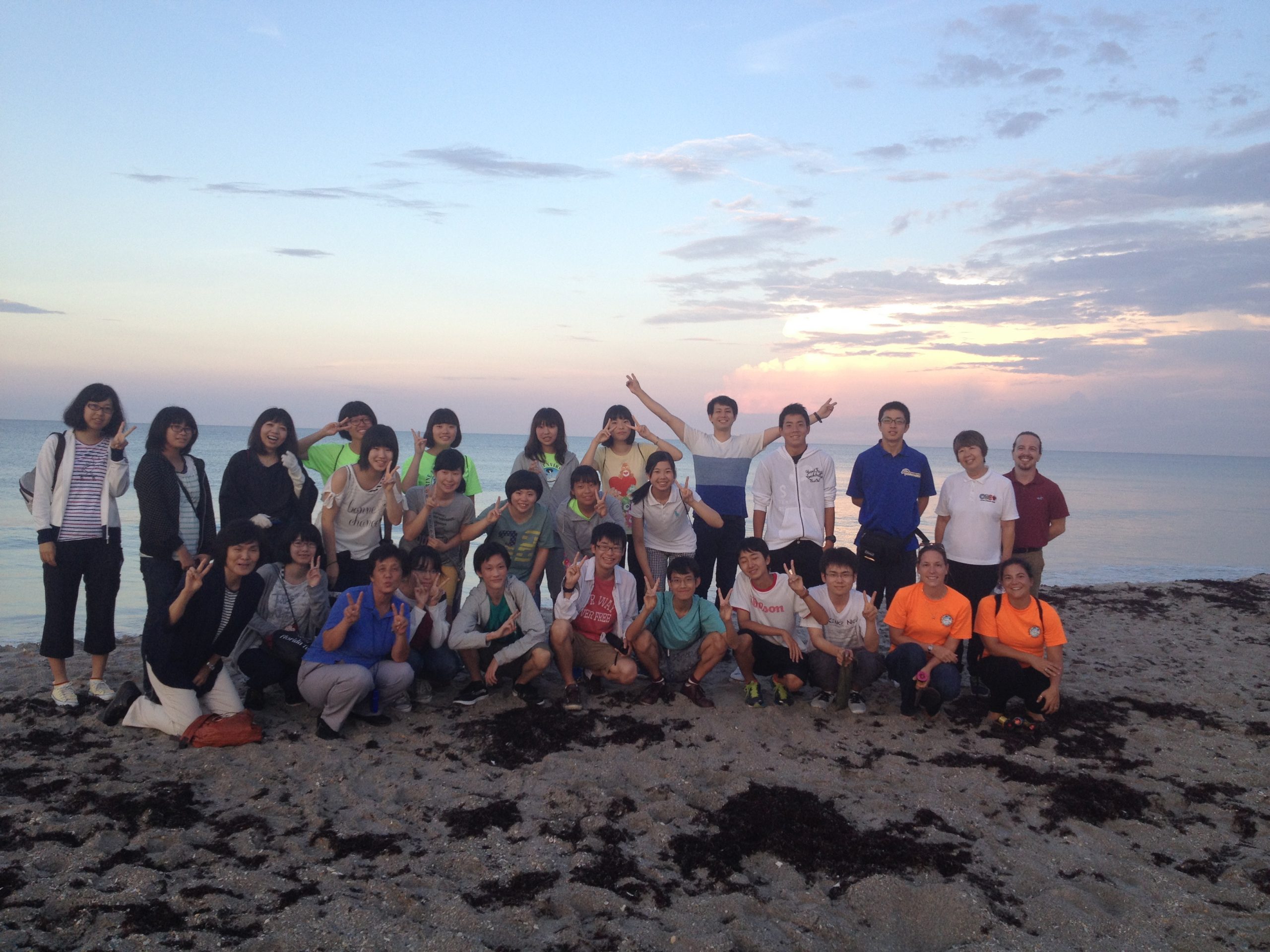 The Mikunigaoka High School, of Japan, joined the Marine & Environmental Science Camp for a day of marine education in the sun! The students traveled to the Sebastian Inlet State Park, where they explored the local waters. Students helped identify many of the organisms, both large and small, that inhabitant local seagrass beds. They saw animals such as the Florida Manatee, hermit crabs, large nine-armed sea stars, sea hares, shrimp, blue crabs, anchovies and other schooling fish. The students also stopped by the Barrier Island Sanctuary, where they interacted with sea turtle exhibits. They even got the chance to hold a turtle skull! The day culminated with a trip to the beach to watch a rocket launch and participate in a turtle walk. The Marine & Environmental Science Camp counselors had a terrific day with the Mikunigaoka High School students, and hope they return next year for more exciting adventures!