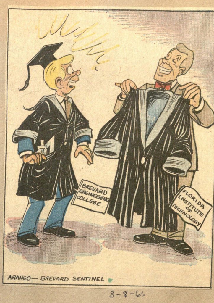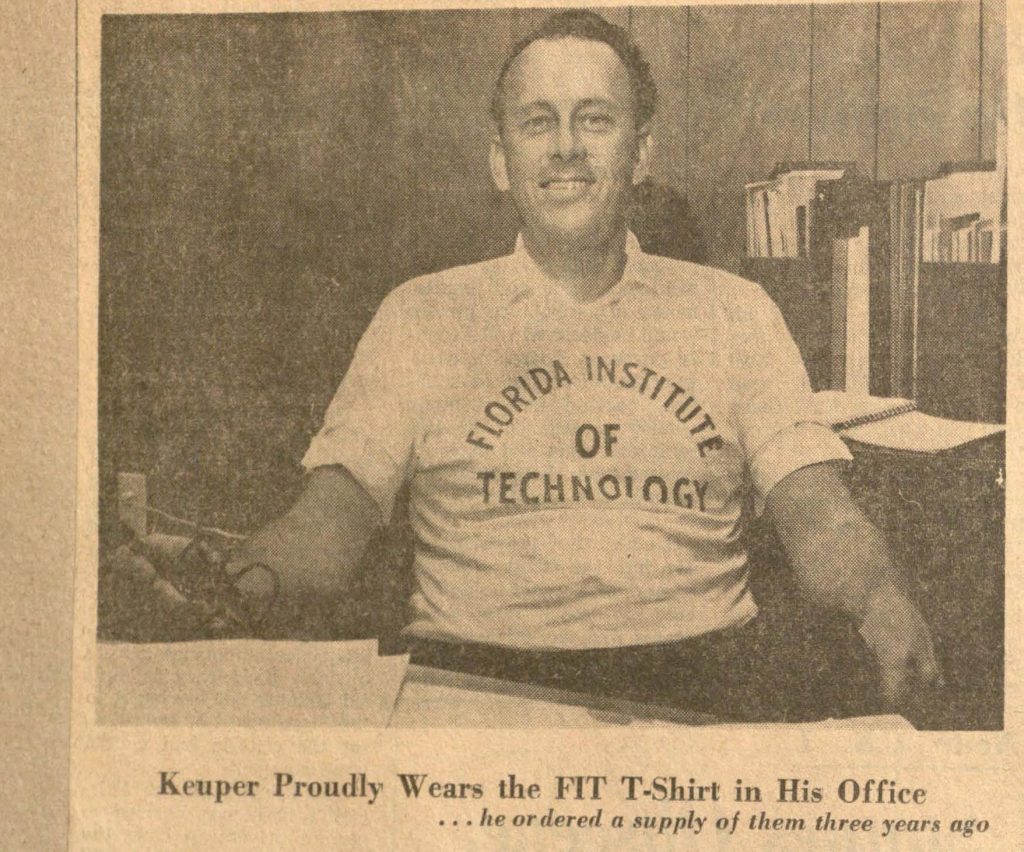 On August 1, 1966, BEC’s Board of Trustees met. Trustee Tom Adams presented a motion to his fellow board members calling for approval of the name change. Two days later Secretary of State Adams announced that his office had “routinely” approved an amendment to the BEC’s educational institution’s charter authorizing the name change. There was an immediate response in Melbourne. Keuper received a phone call from the frantic manager of the school’s bookstore. “He wanted to know,” Keuper chortled, “what he should do with all the Brevard Engineering College T-shirts he had in stock. I told him to double the price and call them collector’s items.”