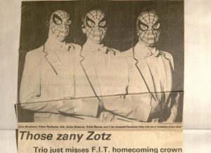 Later Peter Raducha explained that the Zotz Brothers felt it their “mission from God” to make people laugh. “At FIT there’s a lot of technical courses,” Raducha continued. “There’s a lot of pressures. People get really wrapped up in the pressures, the grades.” The Zotz Brothers decided to “break the chain of depression.” Using the house they shared on Auburn Avenue as their base of operations, the Zotz Brothers formulated their plans. Their idea was to periodically appear on campus wearing Spider Man masks and hand out candy to students, faculty and staff.