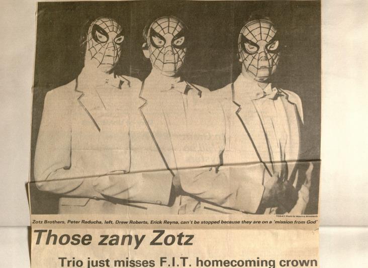 The Zotz mania reached its high point in February 1981 during Florida Tech’s Homecoming Week. The Zotz Brothers launched a campaign to be Homecoming King. During the days leading up to the election, the Zotz Brothers, clad in tuxedos and their usual Spider Man masks, rallied support for their homecoming bid. The first hurdle was getting their names on the Homecoming ballot. Initially, school officials and the homecoming committee frowned on their candidacy. The chief complaint, Drew Roberts recalled, was that the Zotz Brothers were making a “mockery of homecoming.” The Zotz Brothers responded that they were just trying to “have fun.” “Our take,” Roberts declared, “was that it was for the students. If they wanted us, they would vote for us.” The homecoming committee relented, and the Zotz Brothers put in motion an aggressive campaign to turn Florida Tech into the “Kingdom of Zotz.” During homecoming week, the Zotz Brothers stationed themselves in the Quad, shaking hands, handing out Zotz, and asking people “to bring by babies for us to kiss if they had any.”