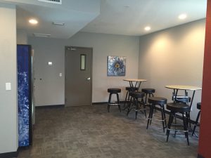 Recently Newman Hall, also known as Mary Star of the Sea, has had a new lounge built in the lobby. Residents of the building and their guests are more than welcome to come and enjoy this space. Tables and chairs ore obviously available, but this space also provides students with a vending machine for some drinks and a television for any needed background noise.