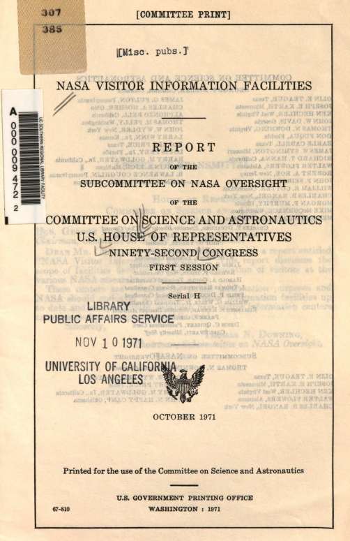 Mickey Mouse’s imminent arrival in Florida led to radical changes at the Kennedy Space Center Visitor Center. In 1971, the congressional Subcommittee on NASA Oversight issued a report assessing the theme park’s impact on the V.I.C. NASA’s consultants believed that a percentage of the tourists who came to Disney World would want to visit K.S.C. They estimated that the number of daily visitors to the V.I.C. would jump from 3000 to 20,000 per day. The V.I.C.’s two buildings were woefully inadequate. Teague’s Oversight Committee recommended a multi-million dollar expansion of the Visitor Center.