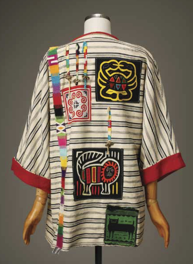 Image: Ruth Funk, Square-cut Jacket, USA, c. 1993. Cotton denim, Panamanian molas, Mexican milagros (animal charms), Mexican belts, Colombian appliqué panels, German skirt fabric, Hmong panels. Gift of Ruth Funk, 2010.09.21.