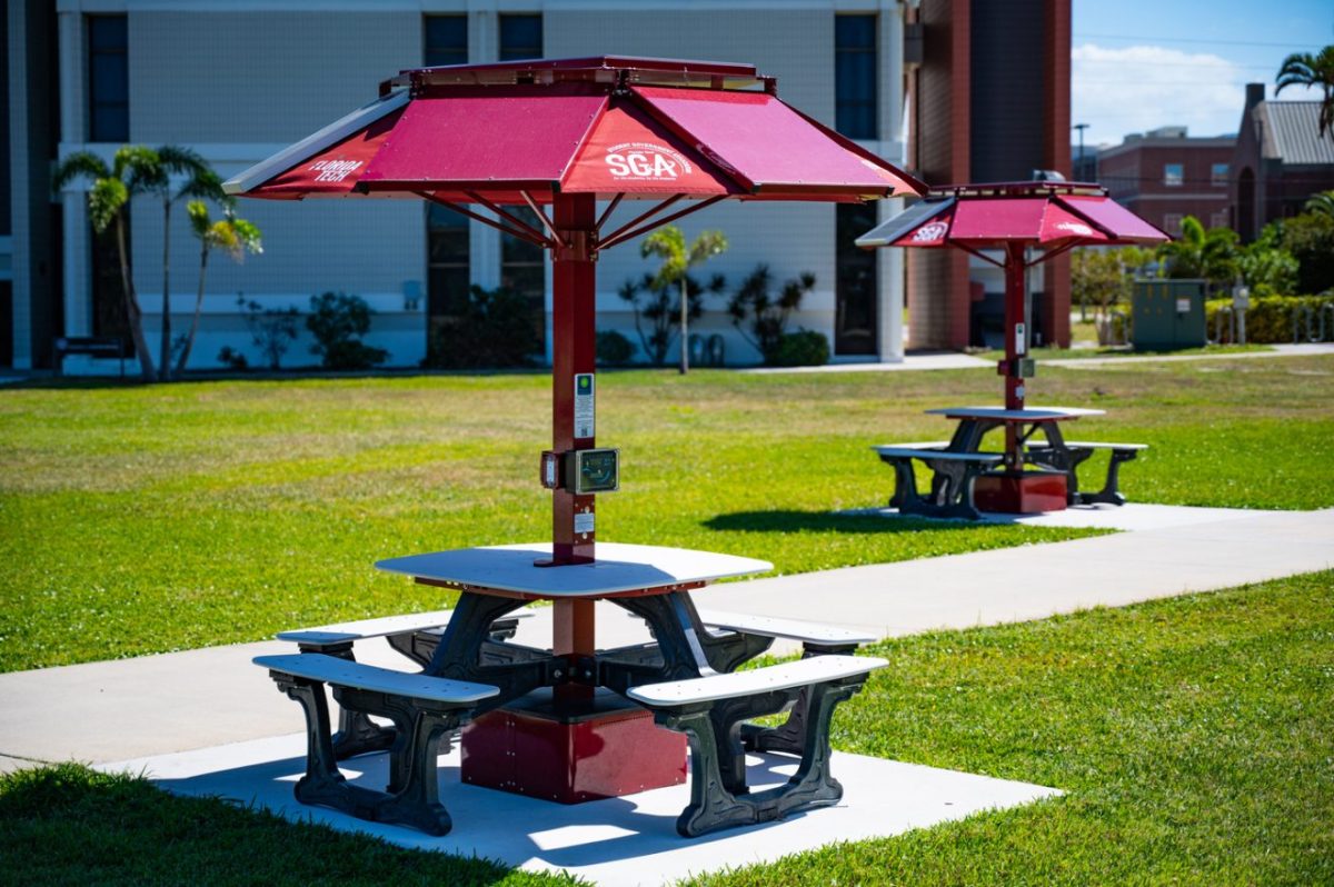 Florida Tech received a Green Rating of 92, up two points from its 2022 rating. The Review noted a series of sustainable practices and related programs in place at the Melbourne university, including a sustainability focused degree program, a free campus shuttle and multiple student organizations working on sustainability issues, such as the solar charging tables with motion-sensing night lights (pictured above) placed around campus through funding from the Student Government Association.