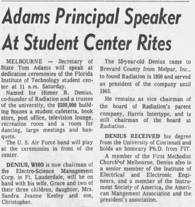 Article about Homer R. Denius Student Center dedication published in the Orlando Evening Star Feb. 21, 1969, page 13
