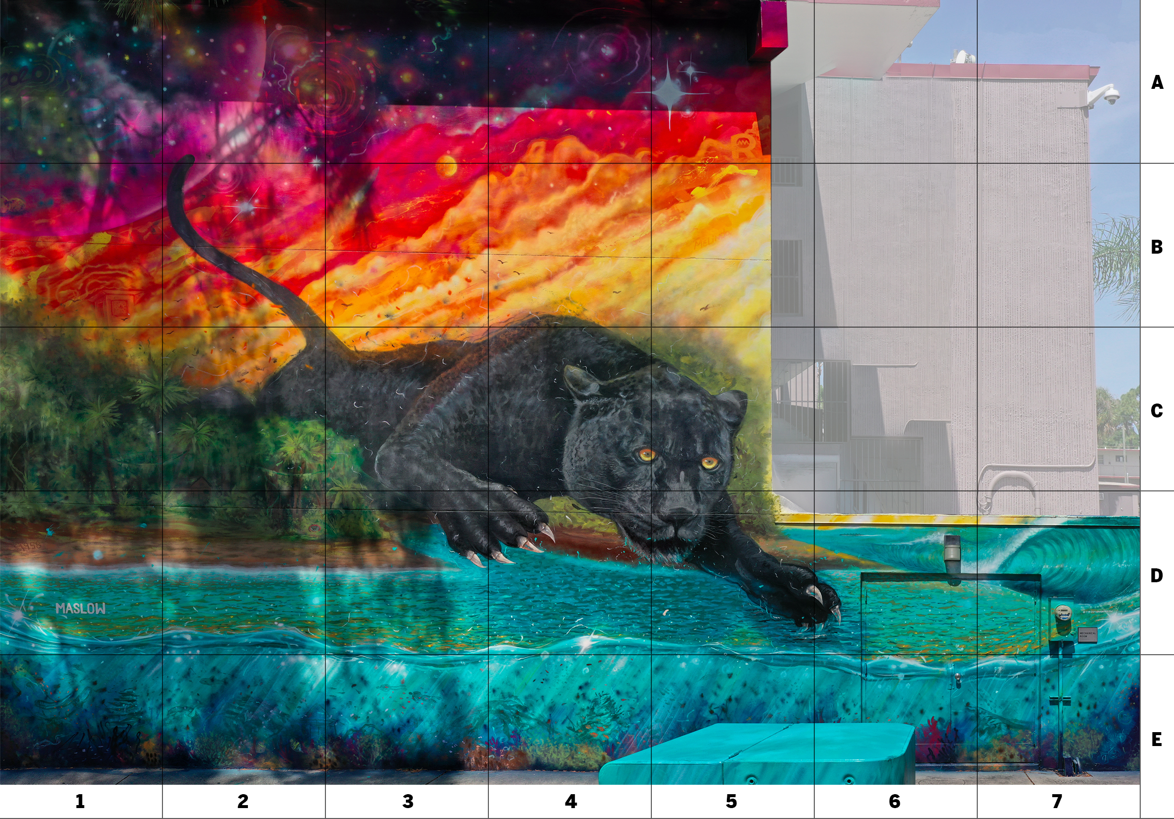 A companion to Florida Tech’s landmark mural in Downtown Melbourne and created by the same artist, Christopher Maslow, “Relentless” stands three stories high and, like the downtown mural, depicts a Panther plunging through space, sky, land and sea—a nod to the many areas in which the university conducts its groundbreaking research.