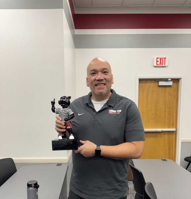 The award’s name highlights the importance of pursuing significant change or action. It is also presented alongside a replica Pete the Panther, the big cat that is Florida Tech’s beloved mascot.
