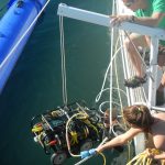 Photo: SeaRobotics’ HullBUG is lowered into the water for a field test.